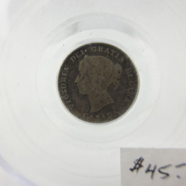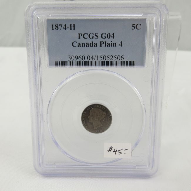 Current Bid: $19.00 [Refresh Price]YOU WILL NEED TO REFRESH THIS PAGE TO SEE UPDATED BID (Log in and this will update automatically) You must LOG IN or REGISTER to see this full page auction listing and bid. Auction is Over Winning Bid Amount: $19.00 **Lot Details: (LOT: F8) - Canada 1874H Five Cents Silver, PCGS Certified in Good Condition. Very Early Victorian .925 Silver Coin, Certified in Older PCGS Hard Holder. Log in to add this lot to your watch list or place a bid |