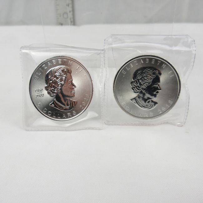 Current Bid: $120.50 [Refresh Price]YOU WILL NEED TO REFRESH THIS PAGE TO SEE UPDATED BID (Log in and this will update automatically) You must LOG IN or REGISTER to see this full page auction listing and bid. Auction is Over Winning Bid Amount: $120.50 **Lot Details: (LOT: F24) - TWO 1 OUNCE SILVER ROUNDS! Canada 2023 Silver Maple Leaf, this .9999 Pure Silver One Ounce Coin Celebrates Queen Elzabeth (RIP). And, a Second Silver Maple Leaf, This one is from 2018. No Tax its bullion Log in to add this lot to your watch list or place a bid |