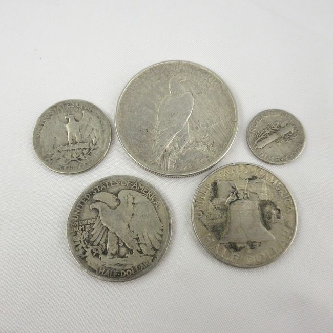Current Bid: $67.00 [Refresh Price]YOU WILL NEED TO REFRESH THIS PAGE TO SEE UPDATED BID (Log in and this will update automatically) You must LOG IN or REGISTER to see this full page auction listing and bid. Auction is Over Winning Bid Amount: $67.00 **Lot Details: (LOT: F26) - USA, Lot of Five Older, .900 Silver Coins. 1922 Peace Dollar, 1940 Walking Liberty Half Dollar, 1950 Franklin Half Dollar, 1944 Washington Quarter and a Beautiful 1929 Winged Mercury Dime. Log in to add this lot to your watch list or place a bid |