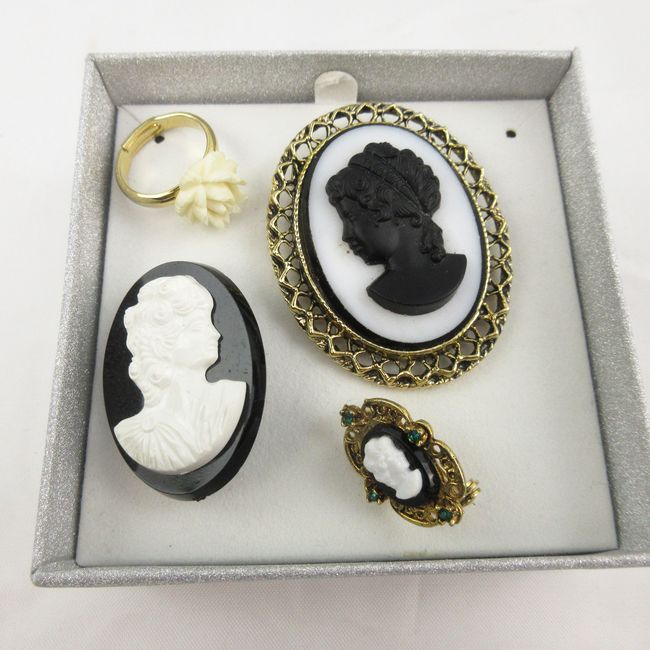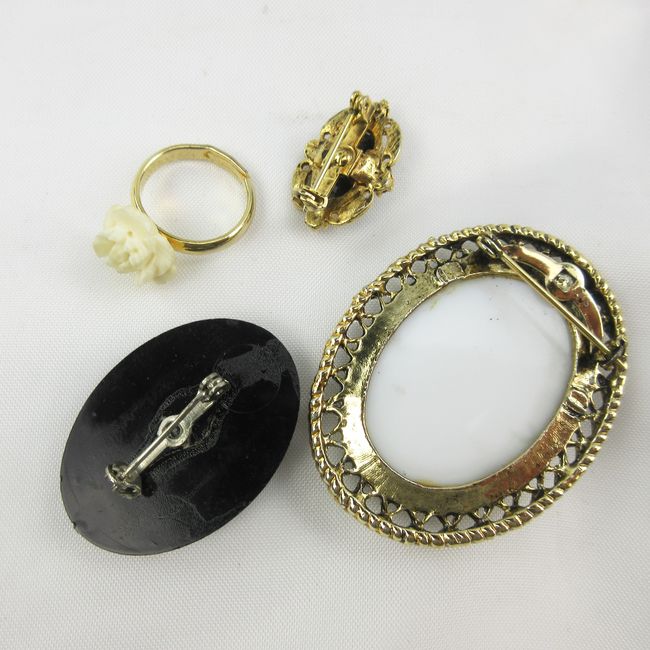 Current Bid: $7.00 [Refresh Price]YOU WILL NEED TO REFRESH THIS PAGE TO SEE UPDATED BID (Log in and this will update automatically) You must LOG IN or REGISTER to see this full page auction listing and bid. Auction is Over Winning Bid Amount: $7.00 **Lot Details: (LOT: F79) - Vintage CAMEOs broaches and a flower ring Log in to add this lot to your watch list or place a bid |
