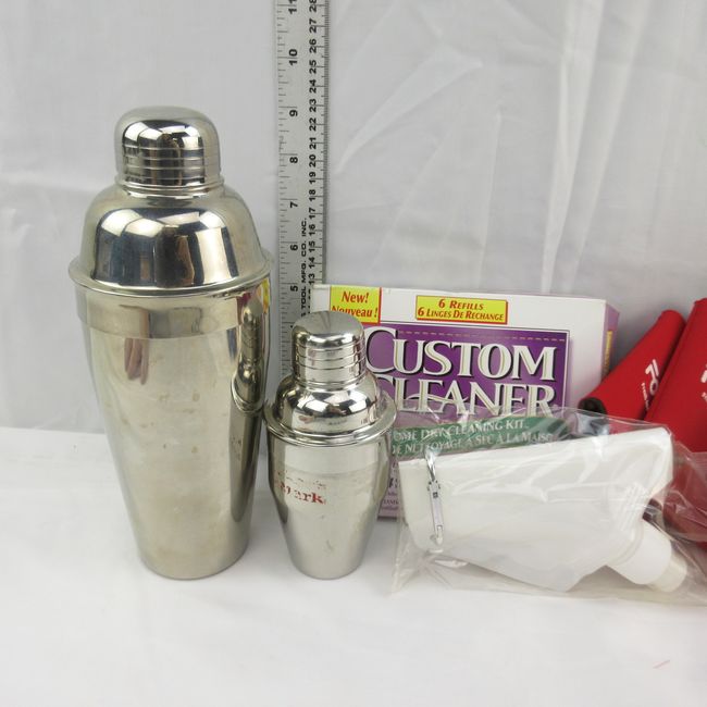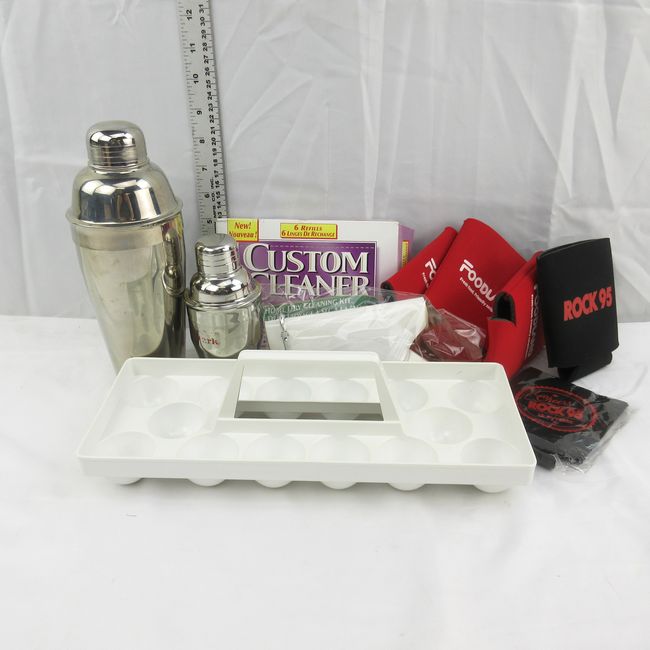 Current Bid: $5.00 [Refresh Price]YOU WILL NEED TO REFRESH THIS PAGE TO SEE UPDATED BID (Log in and this will update automatically) You must LOG IN or REGISTER to see this full page auction listing and bid. Auction is Over Winning Bid Amount: $5.00 **Lot Details: (LOT: F117) - This & That summer must haves, 1 large and 1 small drink shakers, hot cup holders, egg crate can be used to serve multiple drink ingredients like sliced lemons, limes, cherries, etc, home Dry Cleaning Kit, Log in to add this lot to your watch list or place a bid |