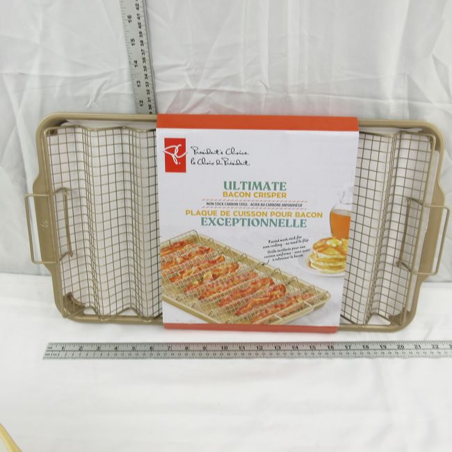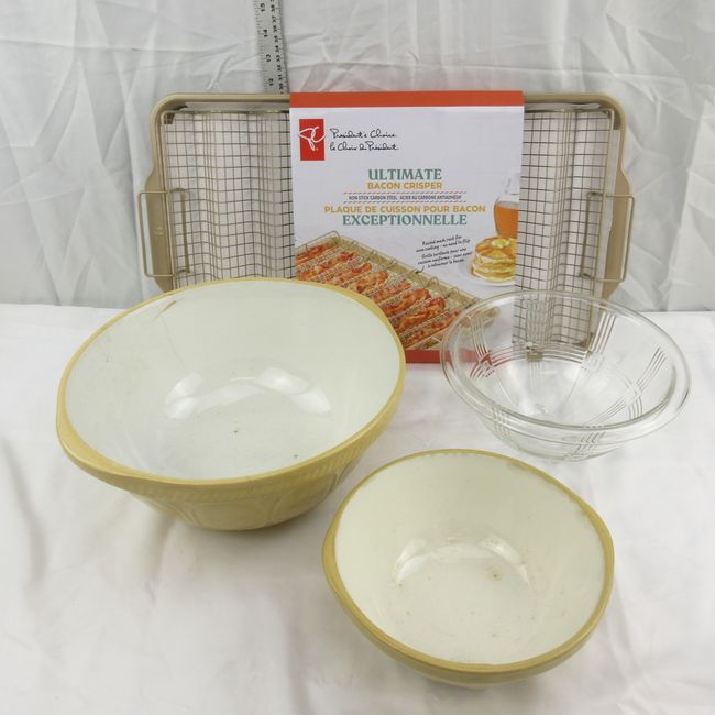 Current Bid: $22.00 [Refresh Price]YOU WILL NEED TO REFRESH THIS PAGE TO SEE UPDATED BID (Log in and this will update automatically) You must LOG IN or REGISTER to see this full page auction listing and bid. Auction is Over Winning Bid Amount: $22.00 **Lot Details: (LOT: F216) - Assorted kitchen items. The first one is a brand new PC Ultimate Bacon Crisper in its original package, the second and third items are vintage “Gripstand” mixing bowls (the large bowl has a chip on the upper insi... Log in to add this lot to your watch list or place a bid |