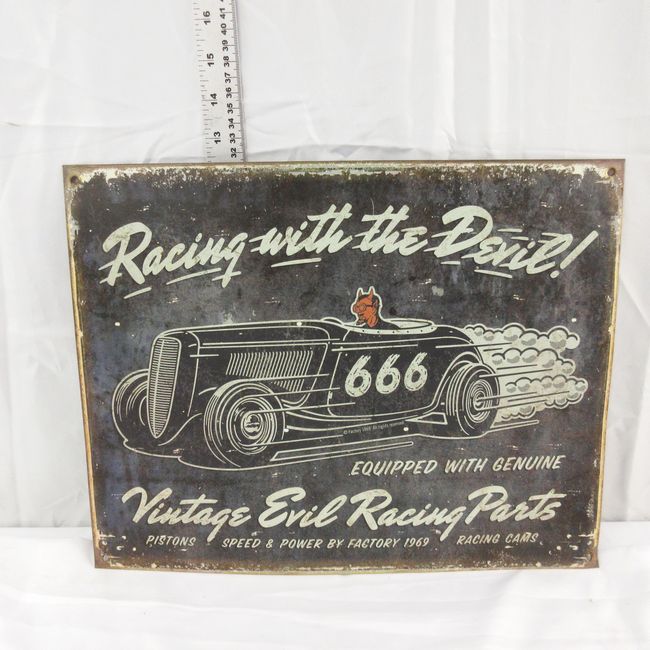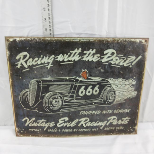 Current Bid: $15.00 [Refresh Price]YOU WILL NEED TO REFRESH THIS PAGE TO SEE UPDATED BID (Log in and this will update automatically) You must LOG IN or REGISTER to see this full page auction listing and bid. Auction is Over Winning Bid Amount: $15.00 **Lot Details: (LOT: F237) - vintage Racing with the Devil Tin metal Sign 12.5” x 16” Log in to add this lot to your watch list or place a bid |