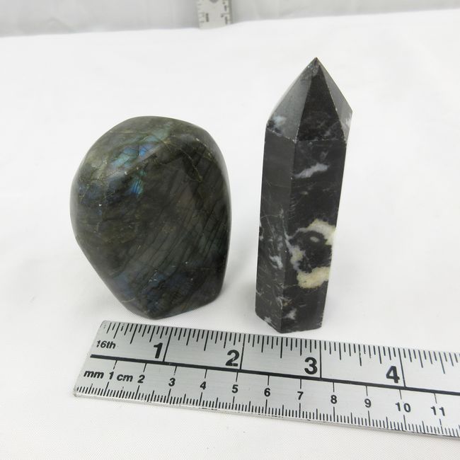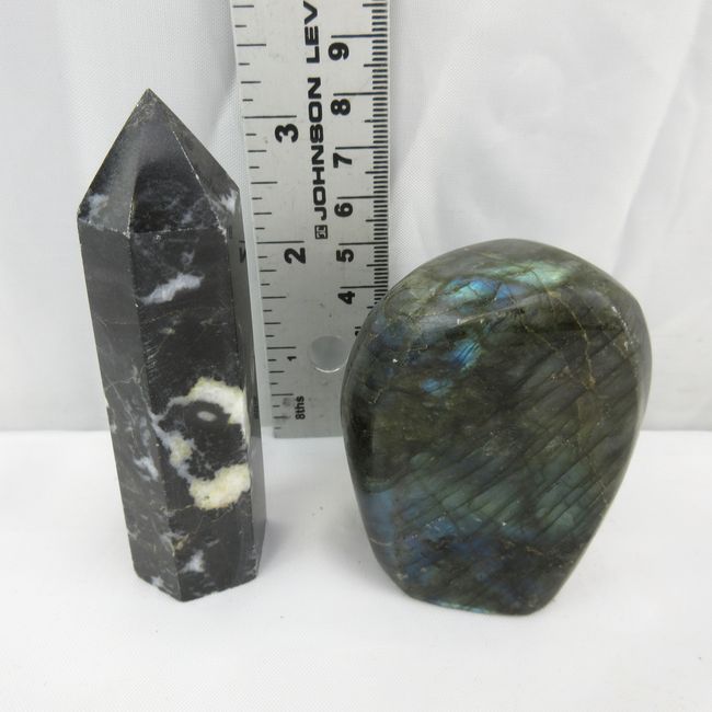 Current Bid: $12.00 [Refresh Price]YOU WILL NEED TO REFRESH THIS PAGE TO SEE UPDATED BID (Log in and this will update automatically) You must LOG IN or REGISTER to see this full page auction listing and bid. Auction is Over Winning Bid Amount: $12.00 **Lot Details: (LOT: F264) - Nice flashy LABRODOITE freeform polished crystal and a Black Zebra Onyx point crystal tower as well. Log in to add this lot to your watch list or place a bid |