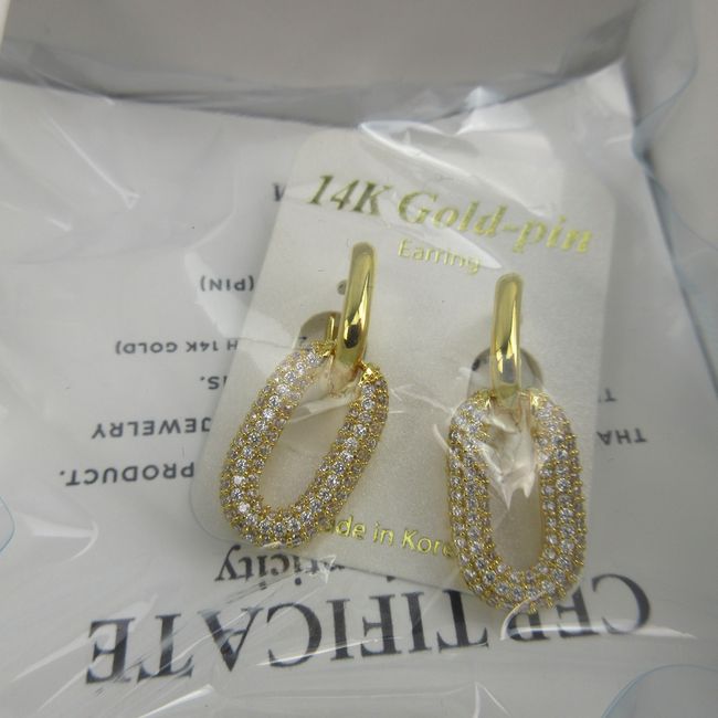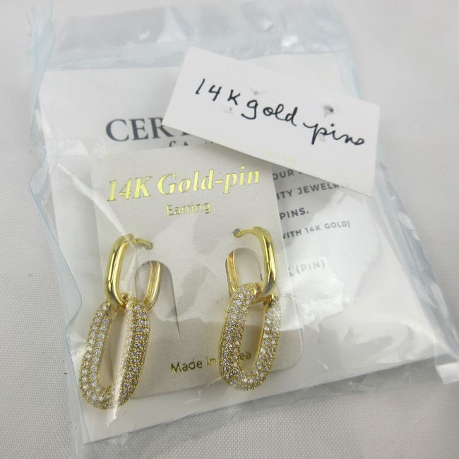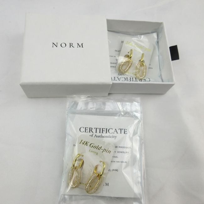 Current Bid: $17.00 [Refresh Price]YOU WILL NEED TO REFRESH THIS PAGE TO SEE UPDATED BID (Log in and this will update automatically) You must LOG IN or REGISTER to see this full page auction listing and bid. Auction is Over Winning Bid Amount: $17.00 **Lot Details: (LOT: G154) - Two brand-new pairs of gold tone pierced earrings by Norm. The back pin part is 14K gold and the earring is 1.25” in total length. Bottom dangling link is adorned by Cubic Zirconia’s. One comes in its original bo... Log in to add this lot to your watch list or place a bid |