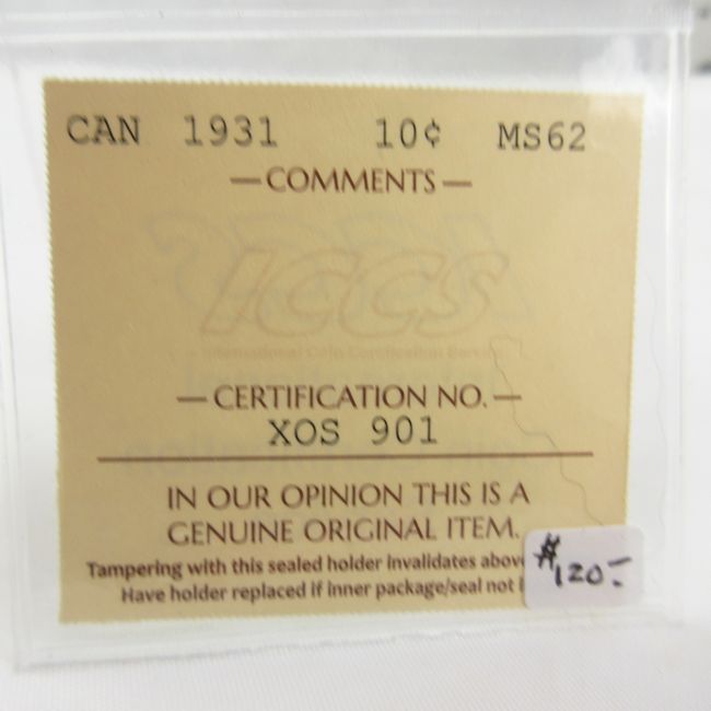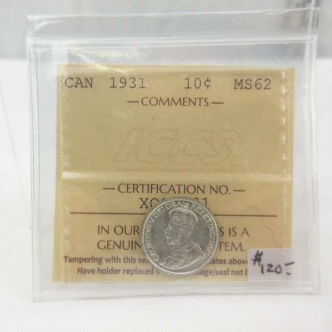 Current Bid: $73.00 [Refresh Price]YOU WILL NEED TO REFRESH THIS PAGE TO SEE UPDATED BID (Log in and this will update automatically) You must LOG IN or REGISTER to see this full page auction listing and bid. Auction is Over Winning Bid Amount: $73.00 **Lot Details: (LOT: H6) - Canada 1931 Ten Cents, ICCS Certified MS-62. Very High Mint State Grade on this Beautiful King George V Silver Dime. Log in to add this lot to your watch list or place a bid |