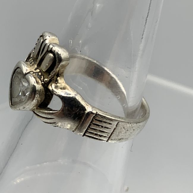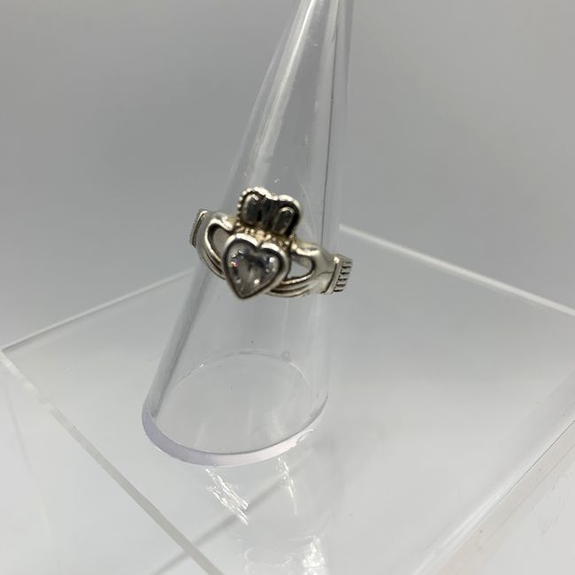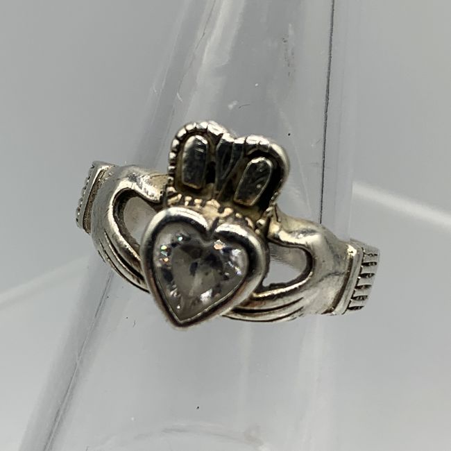Current Bid: $28.50 [Refresh Price]YOU WILL NEED TO REFRESH THIS PAGE TO SEE UPDATED BID (Log in and this will update automatically) You must LOG IN or REGISTER to see this full page auction listing and bid. Auction is Over Winning Bid Amount: $28.50 **Lot Details: (LOT: R20) - Large Sterling Scottish Claddagh Heart Ring with sparkling stones and makers hallmark $ in a circle, representing a Heart for Love, a Crown for Loyalty and Two Hands for Friendship, size 7.75, Verified Sterling and a ... Log in to add this lot to your watch list or place a bid |