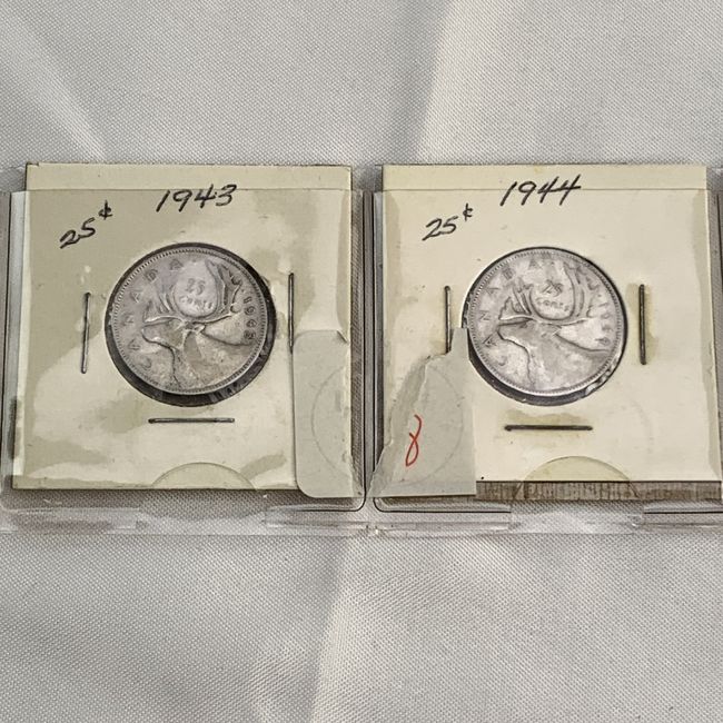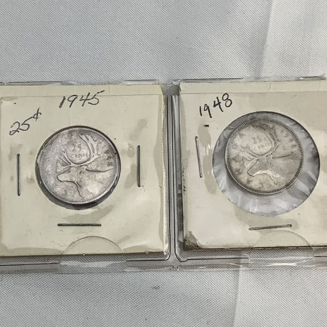 Current Bid: $55.00 [Refresh Price]YOU WILL NEED TO REFRESH THIS PAGE TO SEE UPDATED BID (Log in and this will update automatically) You must LOG IN or REGISTER to see this full page auction listing and bid. Auction is Over Winning Bid Amount: $55.00 **Lot Details: (LOT: R44) - 4 Silver Canadian Quarters 1943 1944 1945 1948 . these are also 80 Percent silver in these! 18.66 grams is pure silver and with current silver prices that about 77.00 in silver! This is what is driving up the prices o... Log in to add this lot to your watch list or place a bid (Number of people watching this lot: 3) |