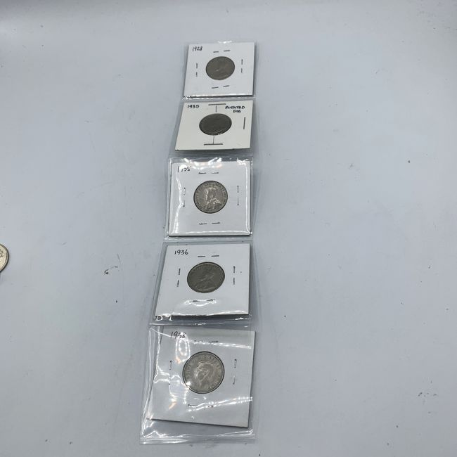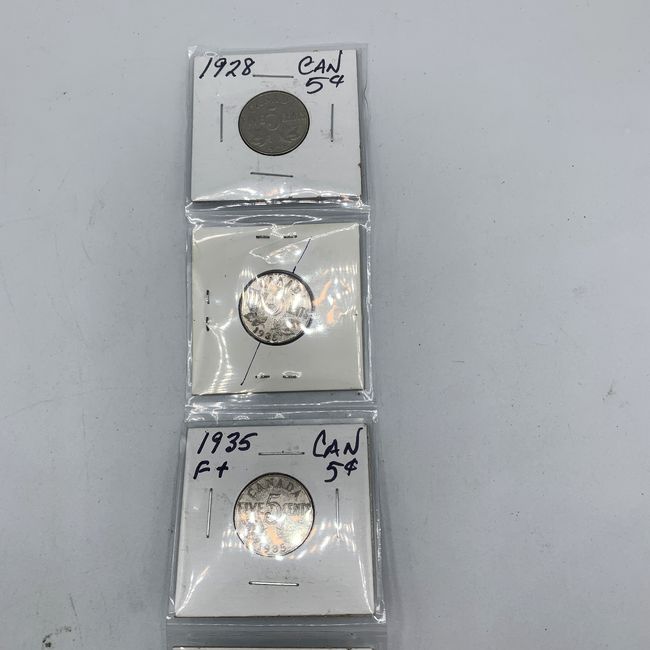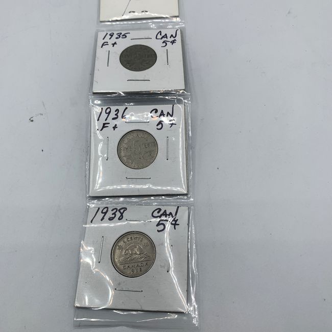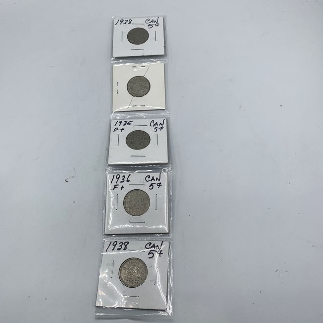 Current Bid: $13.00 [Refresh Price]YOU WILL NEED TO REFRESH THIS PAGE TO SEE UPDATED BID (Log in and this will update automatically) You must LOG IN or REGISTER to see this full page auction listing and bid. Auction is Over Winning Bid Amount: $13.00 **Lot Details: (LOT: R58) - 5 X Canada 5-Cent coins, King George V and King George VI (1928, 1935 x 2, 1936 and 1938) Log in to add this lot to your watch list or place a bid (Number of people watching this lot: 2) |