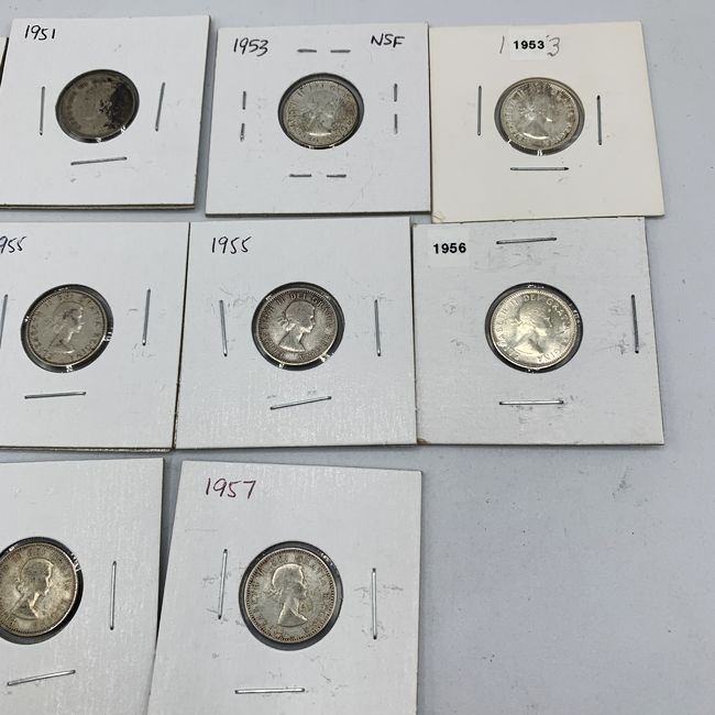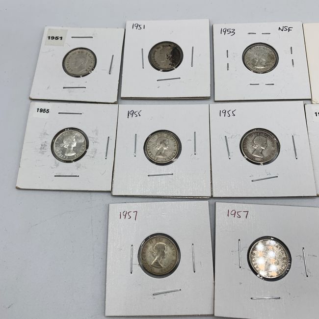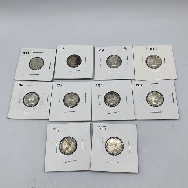 Current Bid: $65.00 [Refresh Price]YOU WILL NEED TO REFRESH THIS PAGE TO SEE UPDATED BID (Log in and this will update automatically) You must LOG IN or REGISTER to see this full page auction listing and bid. Auction is Over Winning Bid Amount: $65.00 **Lot Details: (LOT: R59) - 10 X Canada 10-Cent coins, King George VI and Elizabeth II (1951 x2, 1953 x2, 1955 x 3, 1956, 1957 x2), all 80 per cent silver Log in to add this lot to your watch list or place a bid (Number of people watching this lot: 2) |