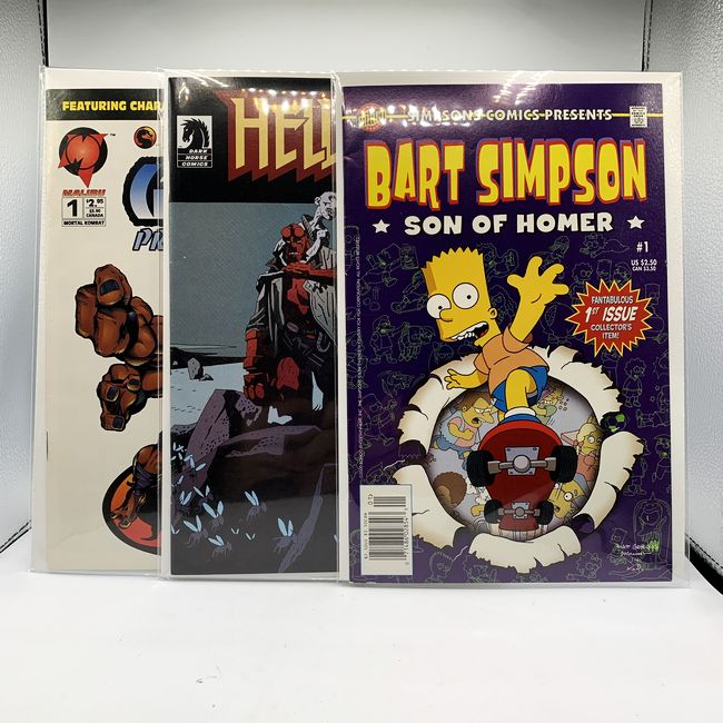 Current Bid: $7.00 [Refresh Price]YOU WILL NEED TO REFRESH THIS PAGE TO SEE UPDATED BID (Log in and this will update automatically) You must LOG IN or REGISTER to see this full page auction listing and bid. Auction is Over Winning Bid Amount: $7.00 **Lot Details: (LOT: R72) - Three perfect ready to be graded number 1 Comics! All high grade 8.5+ easy! includes a 2000 Bart Simpson: Son of Homer #1 comic book. Mortal Kombat: Goro Prince of Pain #1 comic book from 1994 and a Hellboy The Corpse... Log in to add this lot to your watch list or place a bid (Number of people watching this lot: 1) |