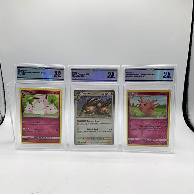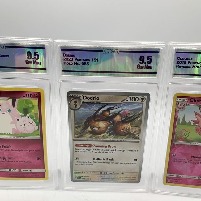 Current Bid: $17.00 [Refresh Price]YOU WILL NEED TO REFRESH THIS PAGE TO SEE UPDATED BID (Log in and this will update automatically) You must LOG IN or REGISTER to see this full page auction listing and bid. Auction is Over Winning Bid Amount: $17.00 **Lot Details: (LOT: R78) - graded Pokémon collectible cards featuring Clefable, Dodrio, and Clefairy. The cards are encased in protective slabs and have been graded 9.5 (Gem Mint) by the grading company Woorium. The Clefable card is a Revers... Log in to add this lot to your watch list or place a bid (Number of people watching this lot: 2) |