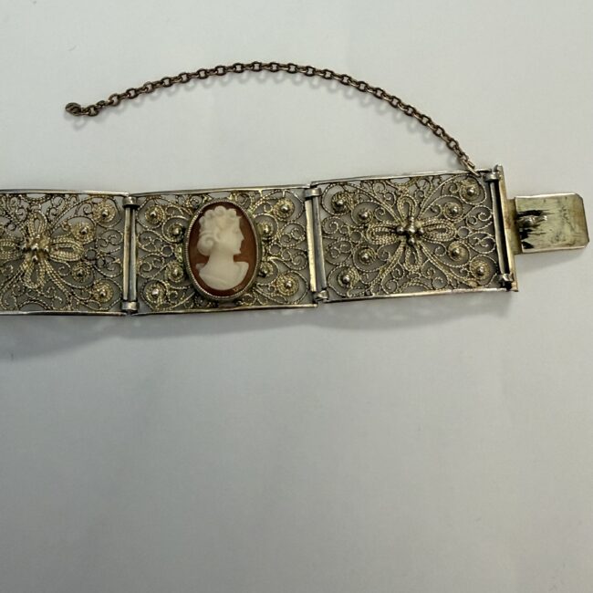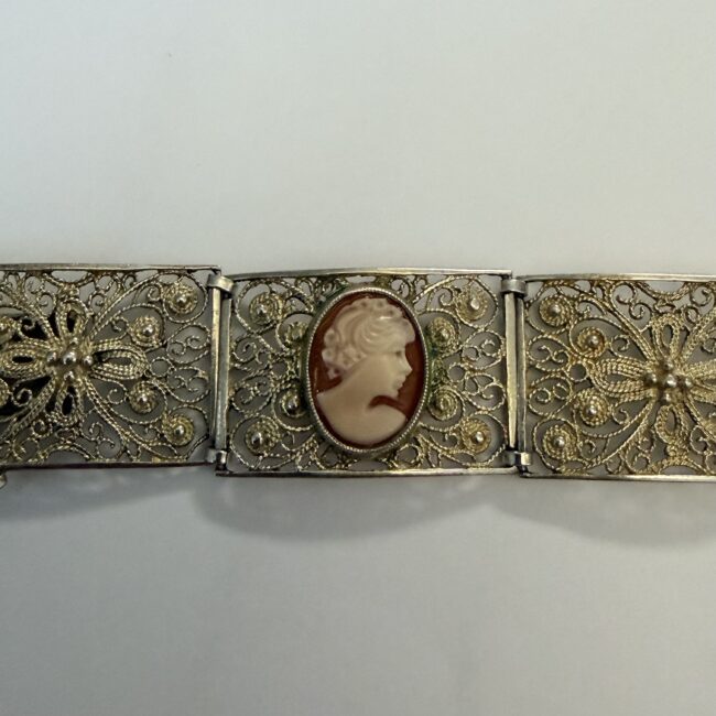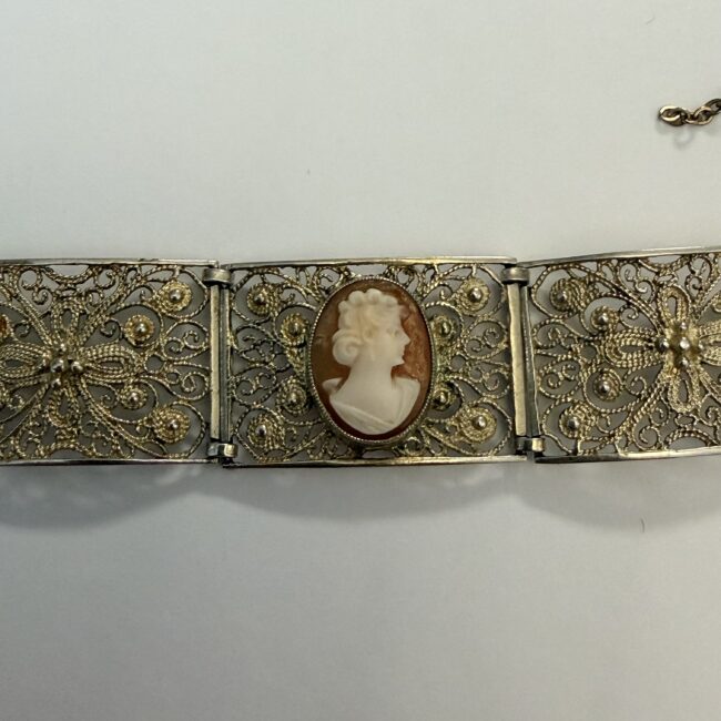 Current Bid: $30.00 [Refresh Price]YOU WILL NEED TO REFRESH THIS PAGE TO SEE UPDATED BID (Log in and this will update automatically) You must LOG IN or REGISTER to see this full page auction listing and bid. Auction is Over Winning Bid Amount: $30.00 **Lot Details: (LOT: R116) - Silver Filigree Carved Cameo Bracelet. This is most likely a Victorian era piece. Each shell Cameo panel is uniquely carved. No visible mark, possibly it has worn off, it tests as silver most likely 800 silver. 7'... Log in to add this lot to your watch list or place a bid (Number of people watching this lot: 1) |
