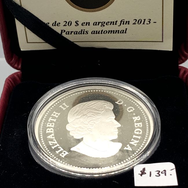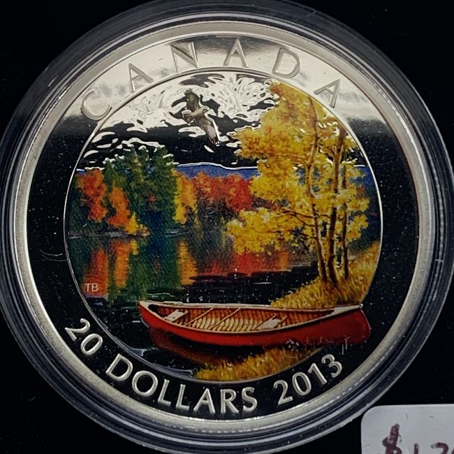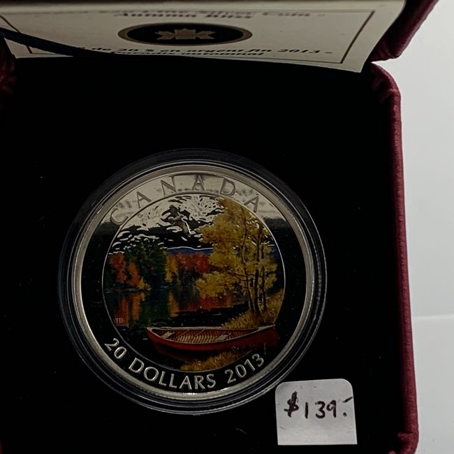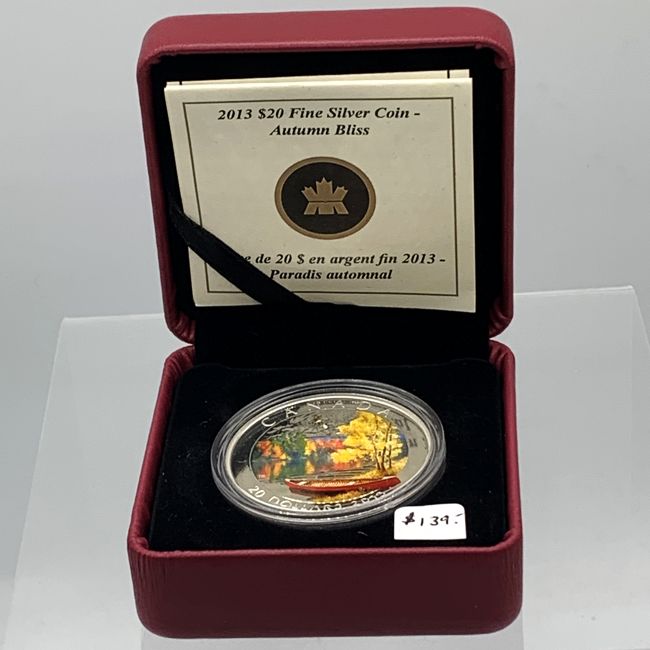 Current Bid: $142.00 [Refresh Price]YOU WILL NEED TO REFRESH THIS PAGE TO SEE UPDATED BID (Log in and this will update automatically) You must LOG IN or REGISTER to see this full page auction listing and bid. Auction is Over Winning Bid Amount: $142.00 **Lot Details: (LOT: S16) - Canada 2013 .9999 Pure Silver Coin Celebrating Autumn Bliss. Only 7500 Minted on this Rare Painted Coin Depicting a “Northern Canadian Lake”. Immediately Sold Out at $139.99. Mint in Box With COA. Log in to add this lot to your watch list or place a bid |