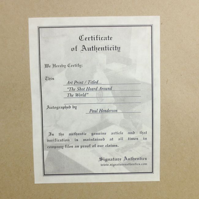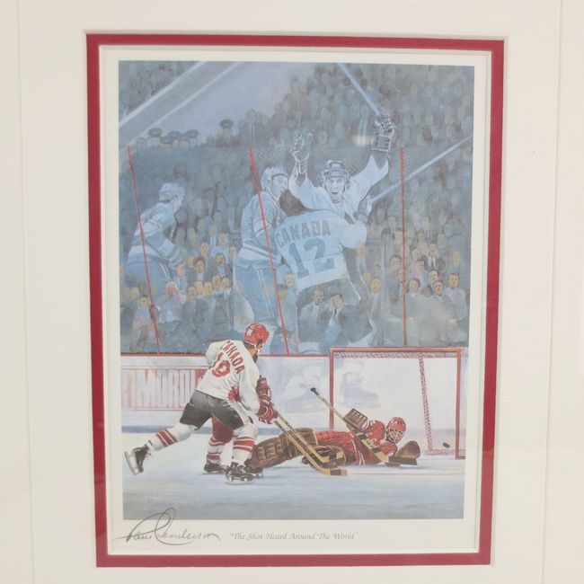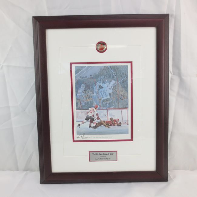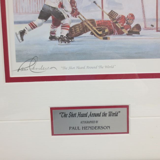 Current Bid: $33.00 [Refresh Price]YOU WILL NEED TO REFRESH THIS PAGE TO SEE UPDATED BID (Log in and this will update automatically) You must LOG IN or REGISTER to see this full page auction listing and bid. Auction is Over Winning Bid Amount: $33.00 **Lot Details: (LOT: T285) - Paul Henderson signed framed print titled “The Shot Heard Around the World,” artwork by Ken Danby, autographed by Paul Henderson and includes Certificate of Authenticity from Signature Authentics, features Team C... Log in to add this lot to your watch list or place a bid |