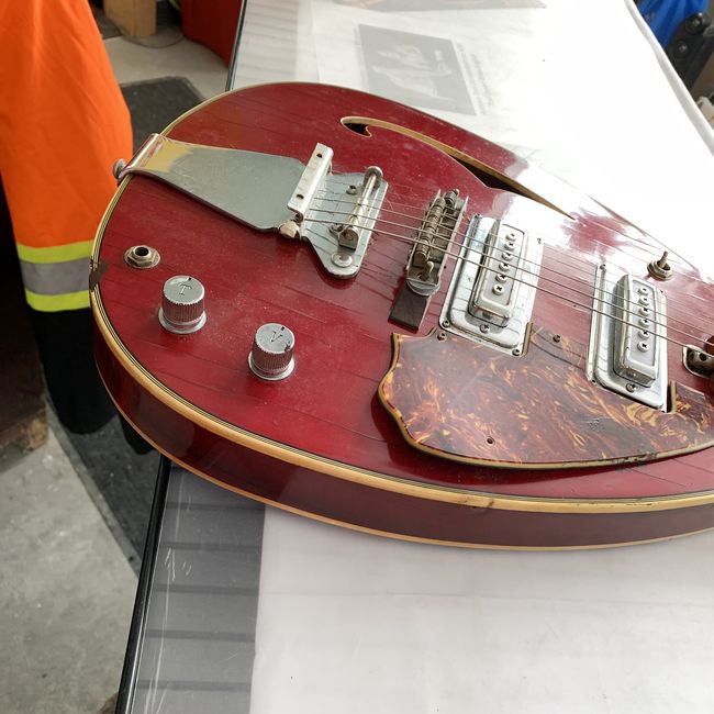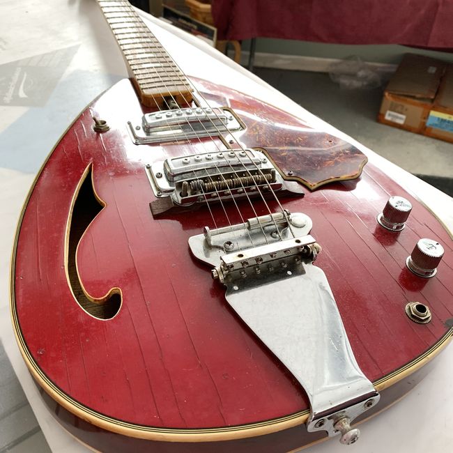 Current Bid: $302.00 [Refresh Price]YOU WILL NEED TO REFRESH THIS PAGE TO SEE UPDATED BID (Log in and this will update automatically) You must LOG IN or REGISTER to see this full page auction listing and bid. Auction is Over Winning Bid Amount: $302.00 **Lot Details: (LOT: T102) - 1960s Domino Teisco Tear Drop Fireball semi hollow body guitar. This needs some work but its worth fixing. We plugged it in and it does not work, has some hairlines and a curved neck (truss rod however so it should b... Log in to add this lot to your watch list or place a bid |