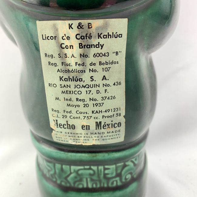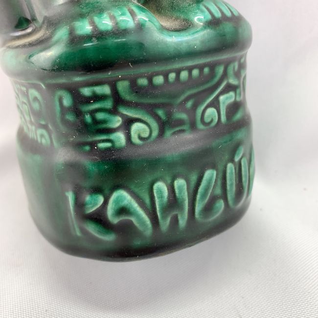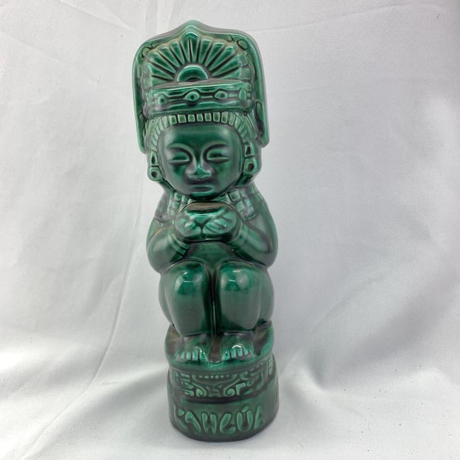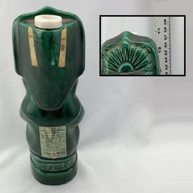 Current Bid: $11.00 [Refresh Price]YOU WILL NEED TO REFRESH THIS PAGE TO SEE UPDATED BID (Log in and this will update automatically) You must LOG IN or REGISTER to see this full page auction listing and bid. Auction is Over Winning Bid Amount: $11.00 **Lot Details: (LOT: T128) - 1930s K&B Kahlua Tiki Decanter: Rare green glazed ceramic Tiki Idol bottle. 757ml capacity, stands 11” tall. Empty/Vintage condition. Log in to add this lot to your watch list or place a bid |