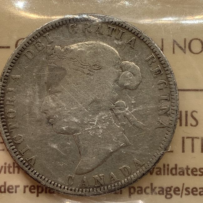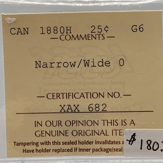Current Bid: $56.00 [Refresh Price]YOU WILL NEED TO REFRESH THIS PAGE TO SEE UPDATED BID (Log in and this will update automatically) You must LOG IN or REGISTER to see this full page auction listing and bid. Auction is Over Winning Bid Amount: $56.00 **Lot Details: (LOT: U10) - Canada 1880H Silver Twenty-Five Cents, ICCS Certified G-6. Low Mintage Silver Quarter Exhibiting the Difficult “Narrow/Wide 0” Variety. Log in to add this lot to your watch list or place a bid |