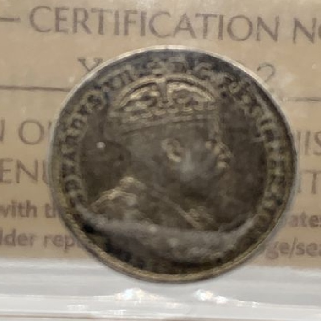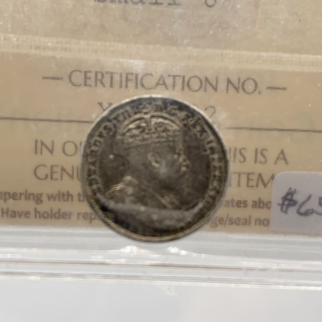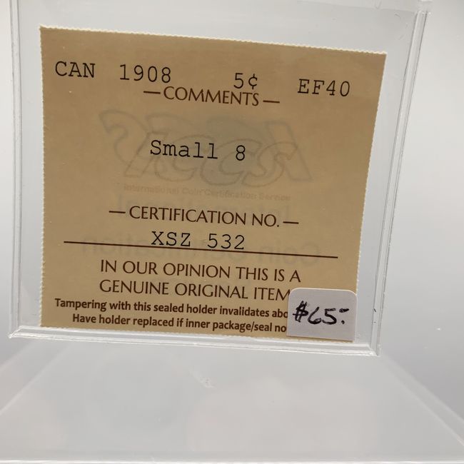 Current Bid: $42.00 [Refresh Price]YOU WILL NEED TO REFRESH THIS PAGE TO SEE UPDATED BID (Log in and this will update automatically) You must LOG IN or REGISTER to see this full page auction listing and bid. Auction is Over Winning Bid Amount: $42.00 **Lot Details: (LOT: U11) - Canada 1908 Silver Five Cents ”Small 8”, ICCS Certified EF-40. Excellent Edwardian Five Cents Silver with No Issues. Log in to add this lot to your watch list or place a bid |