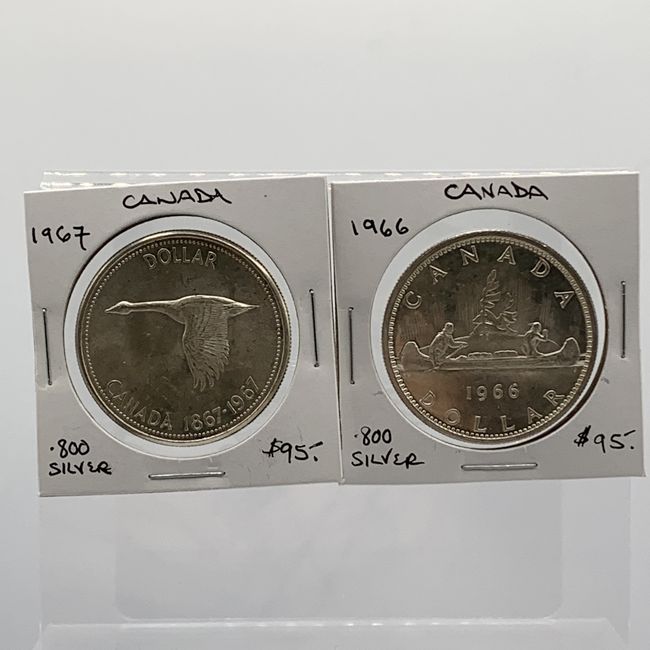 Current Bid: $142.20 [Refresh Price]YOU WILL NEED TO REFRESH THIS PAGE TO SEE UPDATED BID (Log in and this will update automatically) You must LOG IN or REGISTER to see this full page auction listing and bid. Auction is Over Winning Bid Amount: $142.20 **Lot Details: (LOT: U15) - Canada 1966 and 1967 Silver Dollars. Both Beautiful Silver Dollars are .800 Silver Log in to add this lot to your watch list or place a bid |