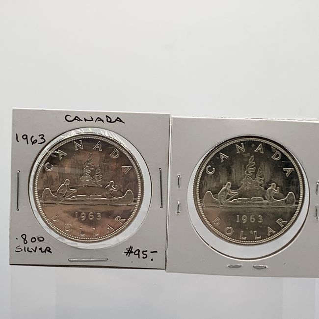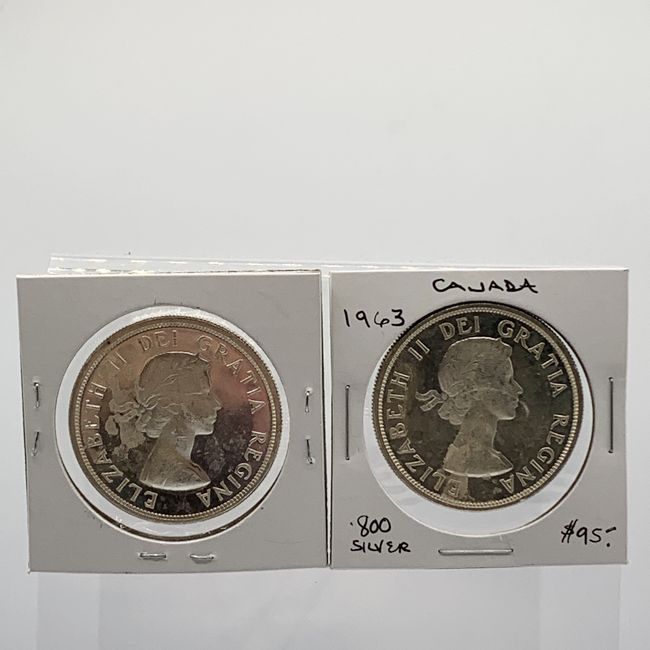 Current Bid: $108.66 [Refresh Price]YOU WILL NEED TO REFRESH THIS PAGE TO SEE UPDATED BID (Log in and this will update automatically) You must LOG IN or REGISTER to see this full page auction listing and bid. Auction is Over Winning Bid Amount: $108.66 **Lot Details: (LOT: U16) - Canada Lot of Two 1963 Silver Dollars. Both Beautiful Silver Dollars are .800 Silver. Log in to add this lot to your watch list or place a bid |