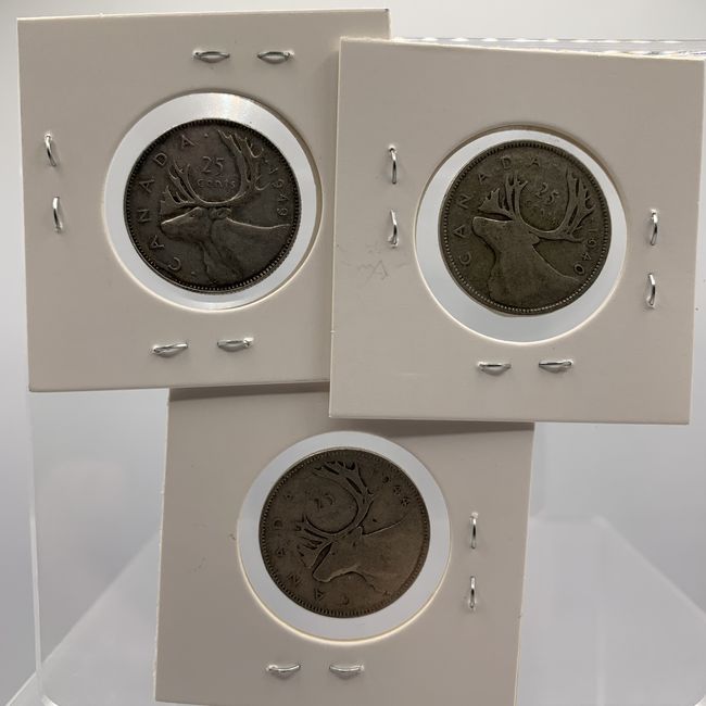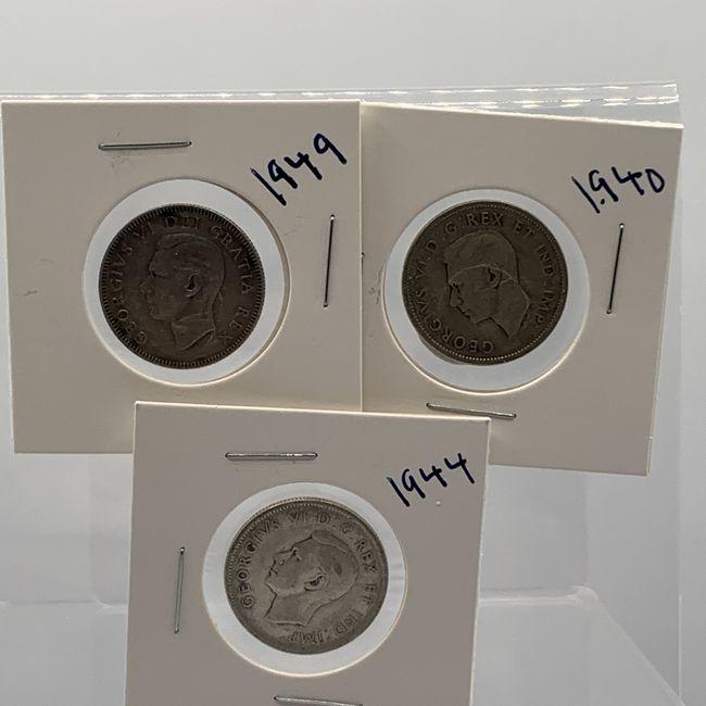 Current Bid: $45.00 [Refresh Price]YOU WILL NEED TO REFRESH THIS PAGE TO SEE UPDATED BID (Log in and this will update automatically) You must LOG IN or REGISTER to see this full page auction listing and bid. Auction is Over Winning Bid Amount: $45.00 **Lot Details: (LOT: U30) - Canadian Silver quarters with King George VI. Three dated 1940, 1944, and 1949. Log in to add this lot to your watch list or place a bid |