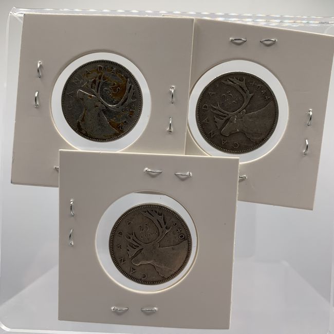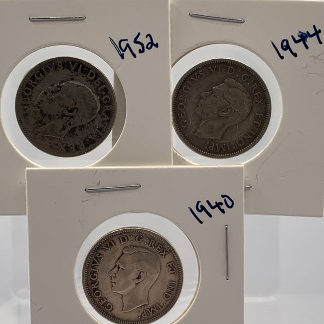Current Bid: $47.50 [Refresh Price]YOU WILL NEED TO REFRESH THIS PAGE TO SEE UPDATED BID (Log in and this will update automatically) You must LOG IN or REGISTER to see this full page auction listing and bid. Auction is Over Winning Bid Amount: $47.50 **Lot Details: (LOT: U32) - Canadian King George VI silver quarters dated 1940, 1944 and 1952. Log in to add this lot to your watch list or place a bid |