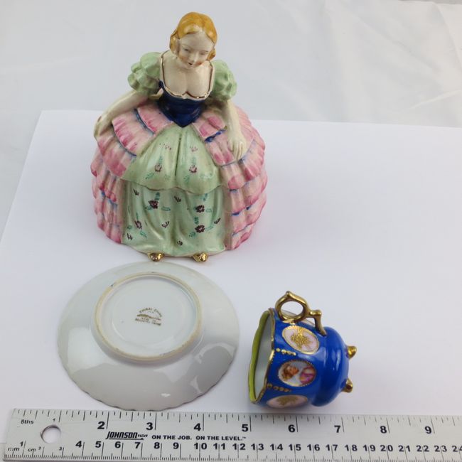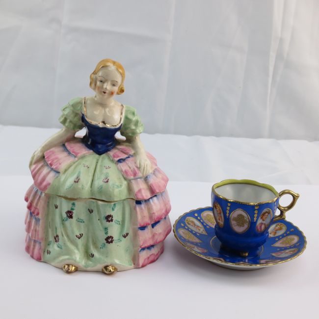 Current Bid: $11.00 [Refresh Price]YOU WILL NEED TO REFRESH THIS PAGE TO SEE UPDATED BID (Log in and this will update automatically) You must LOG IN or REGISTER to see this full page auction listing and bid. Auction is Over Winning Bid Amount: $11.00 **Lot Details: (LOT: U278) - Lady in Victorian dress hand painted trinket/powder dish, Chugai China cup and saucer made in Occupied Japan, no chips/cracks Log in to add this lot to your watch list or place a bid |