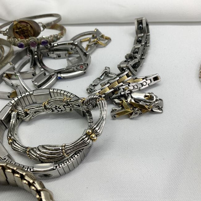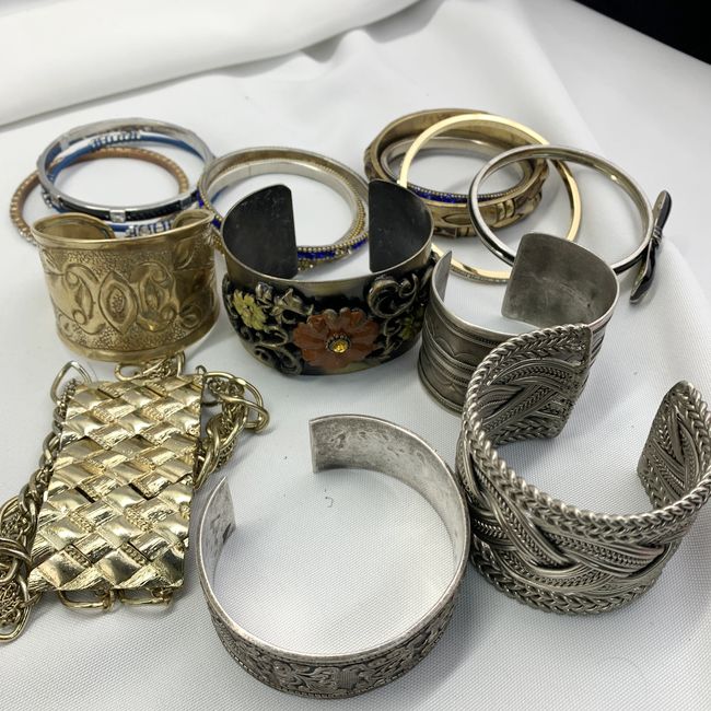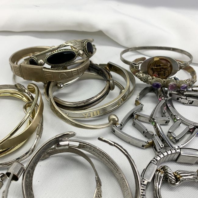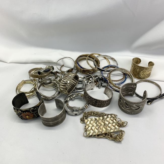 Current Bid: $24.00 [Refresh Price]YOU WILL NEED TO REFRESH THIS PAGE TO SEE UPDATED BID (Log in and this will update automatically) You must LOG IN or REGISTER to see this full page auction listing and bid. Auction is Over Winning Bid Amount: $24.00 **Lot Details: (LOT: U91) - A very good selection of bracelets, some are new but mostly vintage, several are new & some with genuine stones. There are 14 cuff style bracelets, and 2 hook Ons. All are made of some type of metal & some look silver... Log in to add this lot to your watch list or place a bid |
