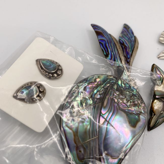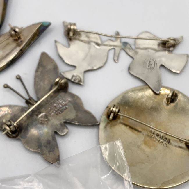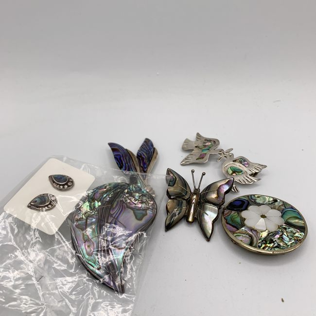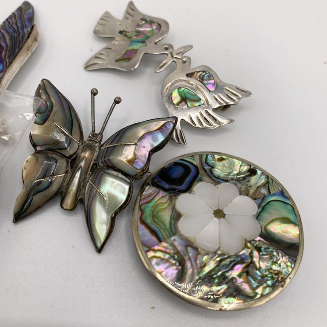 Current Bid: $21.00 [Refresh Price]YOU WILL NEED TO REFRESH THIS PAGE TO SEE UPDATED BID (Log in and this will update automatically) You must LOG IN or REGISTER to see this full page auction listing and bid. Auction is Over Winning Bid Amount: $21.00 **Lot Details: (LOT: U95) - Five vintage brooches with Abalone highlights. The round one with inlay of white shell pieces is marked Alpaca Mexico, it is not silver and it can be worn as a brooch or pendant, The two Doves have all kinds of markin... Log in to add this lot to your watch list or place a bid |