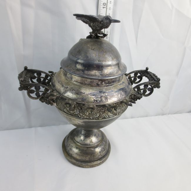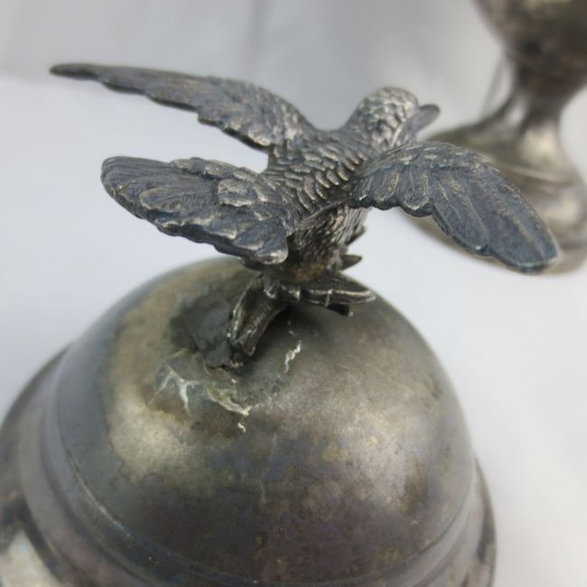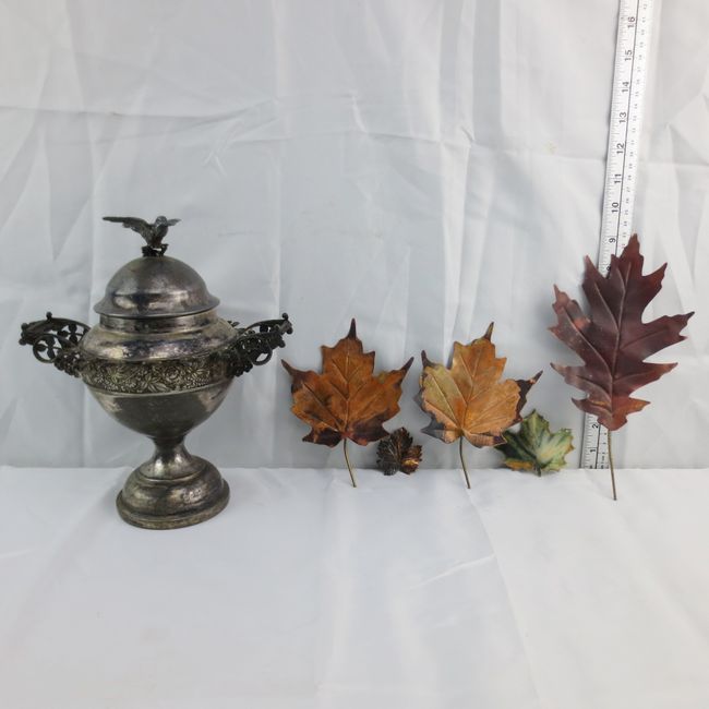 Current Bid: $15.00 [Refresh Price]YOU WILL NEED TO REFRESH THIS PAGE TO SEE UPDATED BID (Log in and this will update automatically) You must LOG IN or REGISTER to see this full page auction listing and bid. Auction is Over Winning Bid Amount: $15.00 **Lot Details: (LOT: U298) - Copper Oak Leaf, Copper Maple Leafs and one ceramic leaf. Also Aunt Alma’s ornate vintage silver plate sugar bowl made by the Toronto Silver Plate Company of Toronto. Repair to the bird on top. Log in to add this lot to your watch list or place a bid |