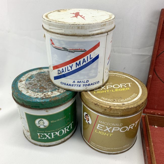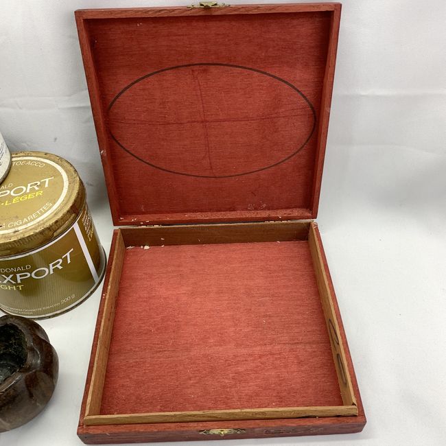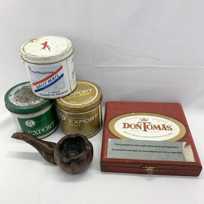 Current Bid: $7.00 [Refresh Price]YOU WILL NEED TO REFRESH THIS PAGE TO SEE UPDATED BID (Log in and this will update automatically) You must LOG IN or REGISTER to see this full page auction listing and bid. Auction is Over Winning Bid Amount: $7.00 **Lot Details: (LOT: U130) - Tobacciana cigarette tins, pipe shaped ashtray and cigar box, includes three cigarette tobacco tins, hand carved pipe shaped ashtray measuring 7 inches and wooden cigar case. Log in to add this lot to your watch list or place a bid |