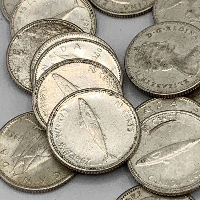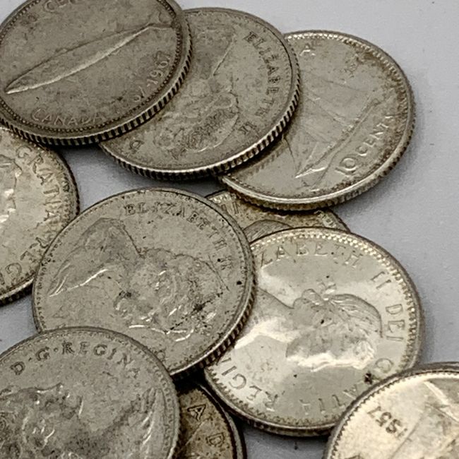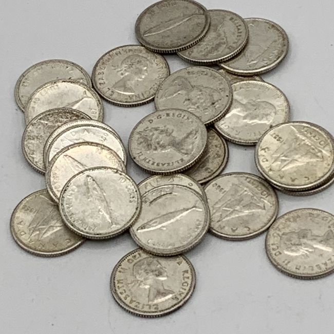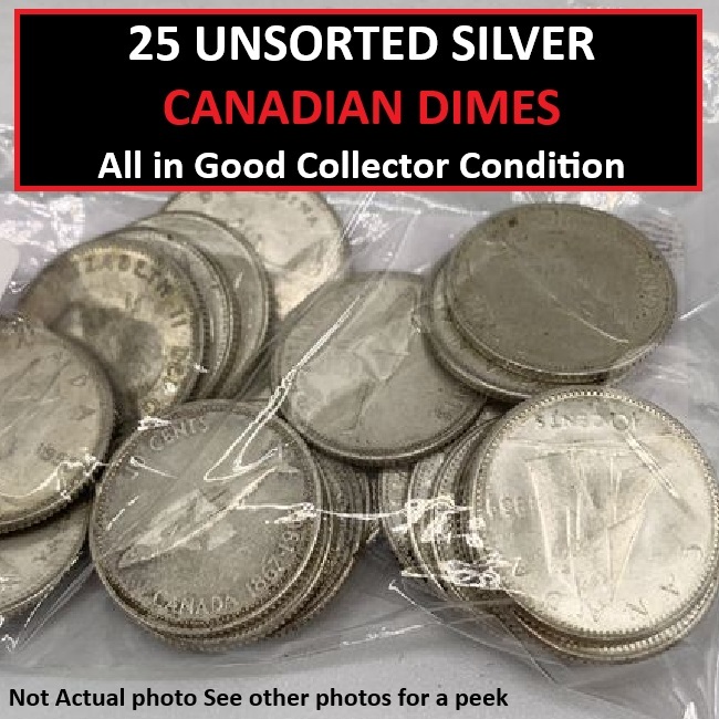 Current Bid: $141.15 [Refresh Price]YOU WILL NEED TO REFRESH THIS PAGE TO SEE UPDATED BID (Log in and this will update automatically) You must LOG IN or REGISTER to see this full page auction listing and bid. Auction is Over Winning Bid Amount: $141.15 **Lot Details: (LOT: U172) - 25 x Surprise bag of all SILVER 1967 or older Canadian DIMES! All silver and all unsorted! All have good readable dates as well. First photo is not of this bag but the other three photos are and give you a sneak pea... Log in to add this lot to your watch list or place a bid |