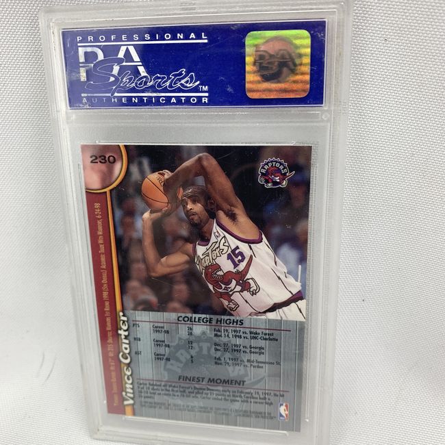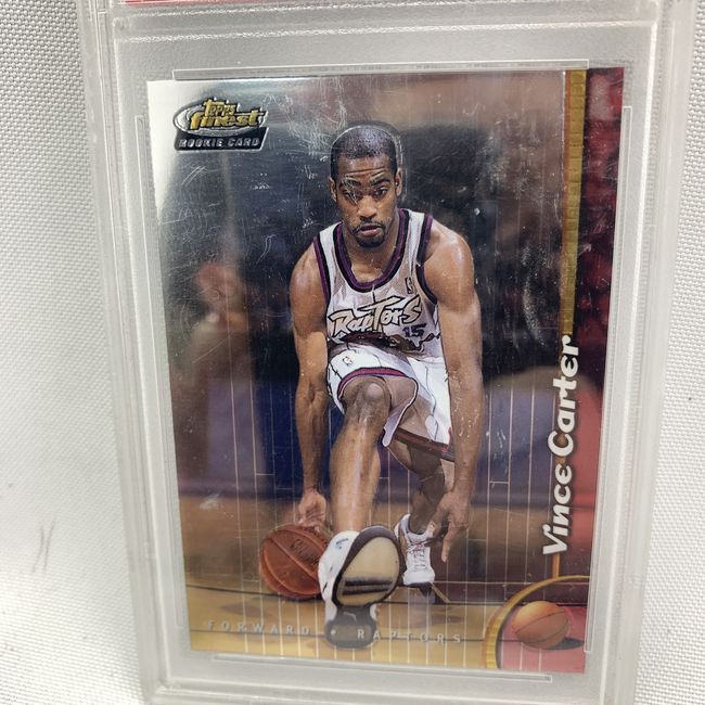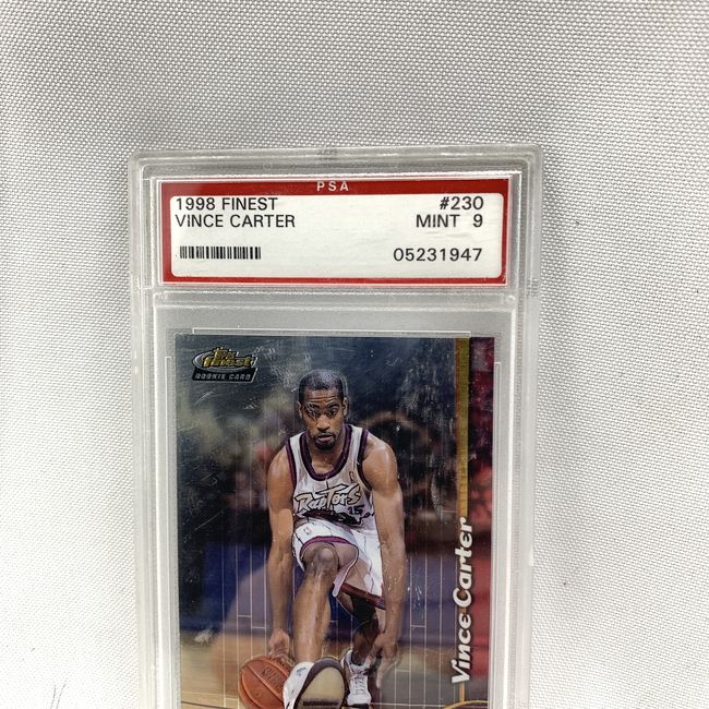 Current Bid: $36.00 [Refresh Price]YOU WILL NEED TO REFRESH THIS PAGE TO SEE UPDATED BID (Log in and this will update automatically) You must LOG IN or REGISTER to see this full page auction listing and bid. Auction is Over Winning Bid Amount: $36.00 **Lot Details: (LOT: V32) - **1998 Topps Finest #230 Vince Carter Rookie RC PSA 9** NBA rookie of the year with the Toronto Raptors. Log in to add this lot to your watch list or place a bid |