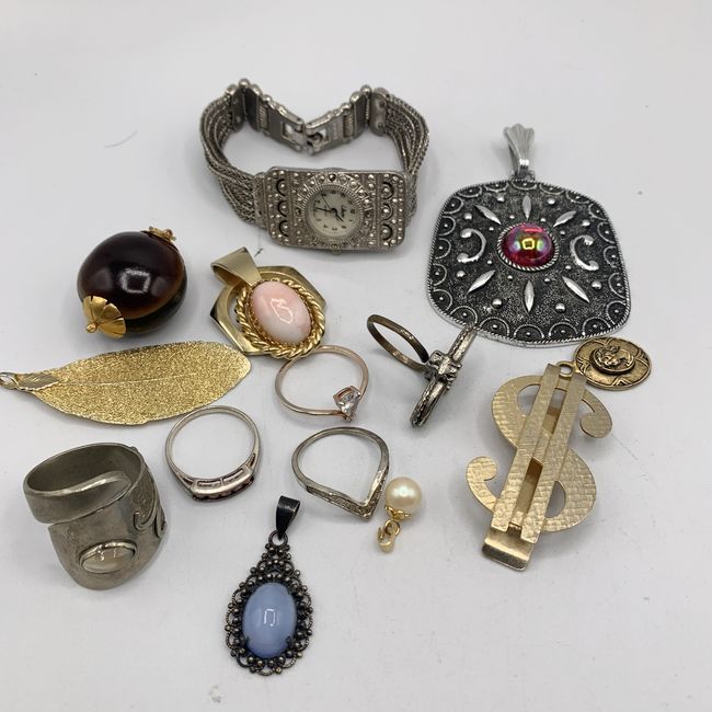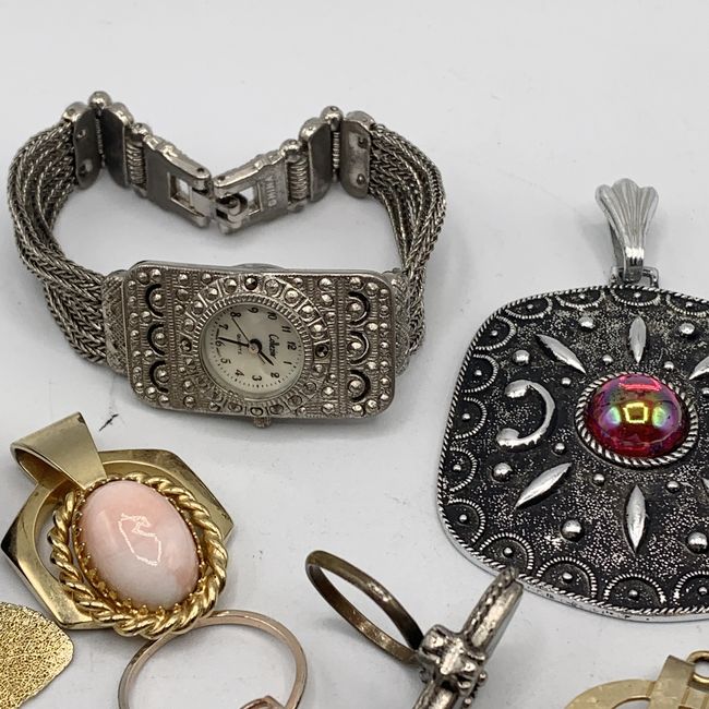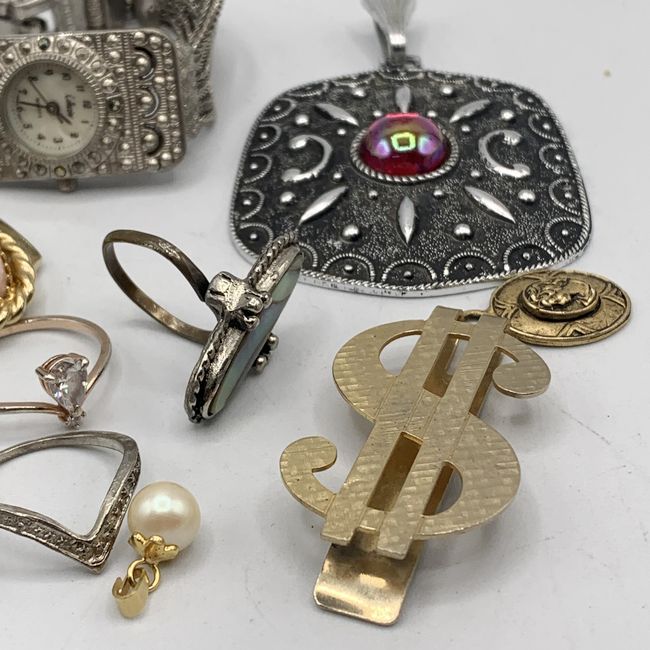 Current Bid: $15.10 [Refresh Price]YOU WILL NEED TO REFRESH THIS PAGE TO SEE UPDATED BID (Log in and this will update automatically) You must LOG IN or REGISTER to see this full page auction listing and bid. Auction is Over Winning Bid Amount: $15.10 **Lot Details: (LOT: V52) - Lot Mixed Jewelry NO JUNK, Rings various sizes, Pendants, Money Clip, Vintage Watch not working requires battery Log in to add this lot to your watch list or place a bid |