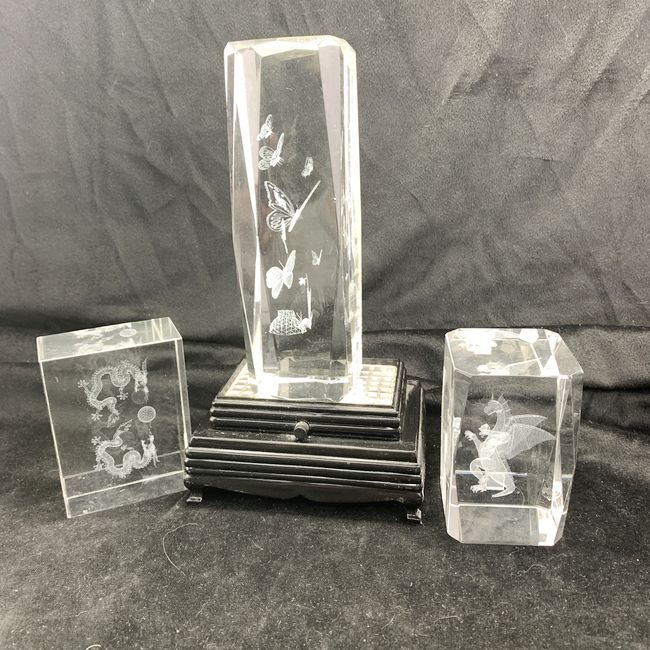 Current Bid: $11.00 [Refresh Price]YOU WILL NEED TO REFRESH THIS PAGE TO SEE UPDATED BID (Log in and this will update automatically) You must LOG IN or REGISTER to see this full page auction listing and bid. Auction is Over Winning Bid Amount: $11.00 **Lot Details: (LOT: V110) - Laser etched 3D butterfly crystal and 2 dragon crystals with color changing lighted stand. Log in to add this lot to your watch list or place a bid |