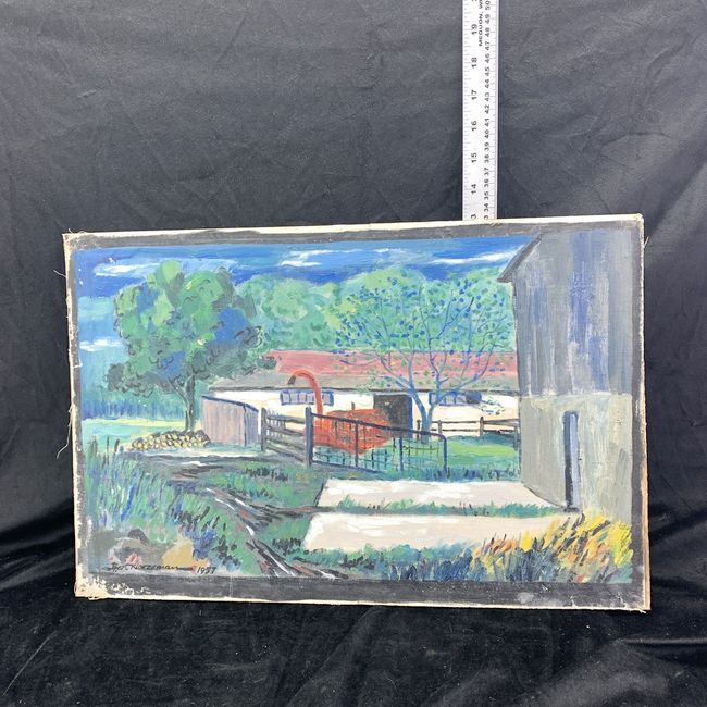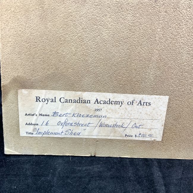 Current Bid: $54.00 [Refresh Price]YOU WILL NEED TO REFRESH THIS PAGE TO SEE UPDATED BID (Log in and this will update automatically) You must LOG IN or REGISTER to see this full page auction listing and bid. Auction is Over Winning Bid Amount: $54.00 **Lot Details: (LOT: V138) - Bert Kloezeman 1957 "Implement Shed" canvas painting mounted on masonite board. Royal Canadian Academy of Arts. Great addition to any Canadiana collection. Signed/dated with label of origin on back. 20"... Log in to add this lot to your watch list or place a bid |