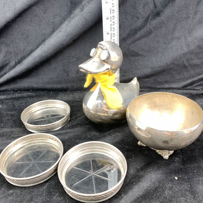 Current Bid: $9.00 [Refresh Price]YOU WILL NEED TO REFRESH THIS PAGE TO SEE UPDATED BID (Log in and this will update automatically) You must LOG IN or REGISTER to see this full page auction listing and bid. Auction is Over Winning Bid Amount: $9.00 **Lot Details: (LOT: V142) - Some fun silver plated items including a duck bank, some drink coasters and a footed bowl. Log in to add this lot to your watch list or place a bid |
