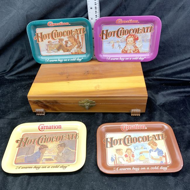 Current Bid: $9.00 [Refresh Price]YOU WILL NEED TO REFRESH THIS PAGE TO SEE UPDATED BID (Log in and this will update automatically) You must LOG IN or REGISTER to see this full page auction listing and bid. Auction is Over Winning Bid Amount: $9.00 **Lot Details: (LOT: V144) - CARNATION Rich and Creamy Hot Chocolate trinket tin trays and a nice footed wooden keepsake box Log in to add this lot to your watch list or place a bid |