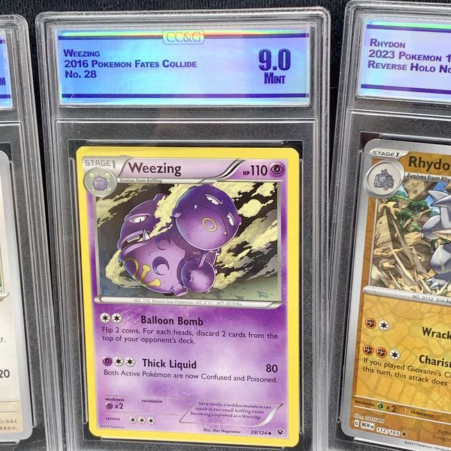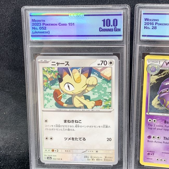 Current Bid: $36.00 [Refresh Price]YOU WILL NEED TO REFRESH THIS PAGE TO SEE UPDATED BID (Log in and this will update automatically) You must LOG IN or REGISTER to see this full page auction listing and bid. Auction is Over Winning Bid Amount: $36.00 **Lot Details: (LOT: V166) - three professionally graded Pokémon Trading Card Game cards enclosed in protective cases. Meowth (No. 052): A Japanese card from the 2023 Pokémon Card 151 set, graded a perfect 10.0. Weezing: Graded a 9.0, this ca... Log in to add this lot to your watch list or place a bid |