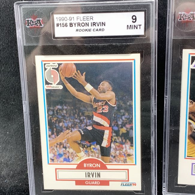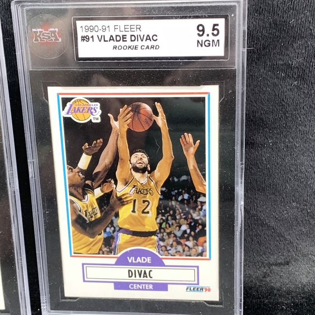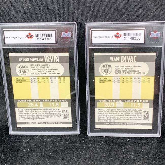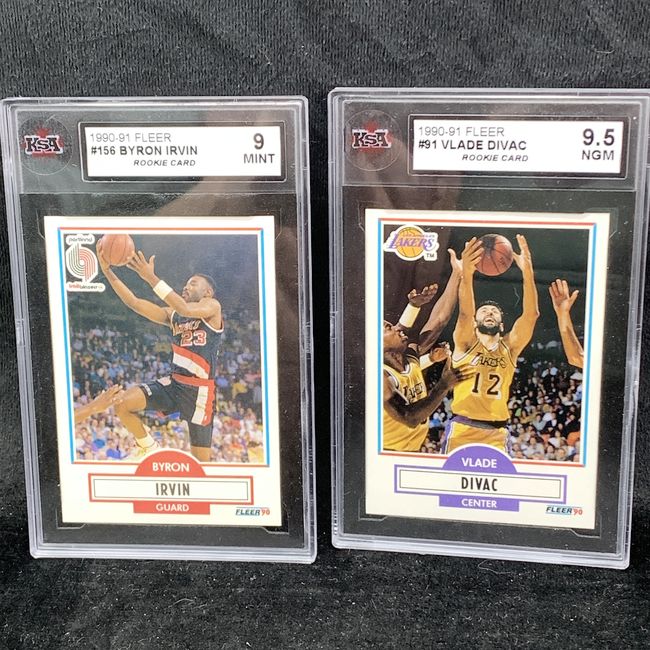 Current Bid: $15.00 [Refresh Price]YOU WILL NEED TO REFRESH THIS PAGE TO SEE UPDATED BID (Log in and this will update automatically) You must LOG IN or REGISTER to see this full page auction listing and bid. Auction is Over Winning Bid Amount: $15.00 **Lot Details: (LOT: V167) - two vintage basketball trading cards from the 1990-91 Fleer set, both professionally graded and slabbed by KSA. Byron Irvin Rookie Card: Card #156, graded as KSA 9 MINT. Vlade Divac Rookie Card: Card #91, graded as... Log in to add this lot to your watch list or place a bid |