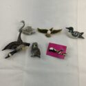 ![]() | (LOT: S253) - Canadian Birds Brooches. Eagle, goose, swan, loon, penguins and owl. The Loon, Canada Goose and owl are hand painted and the eagle has some kind of a natural accent stone. | ||