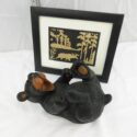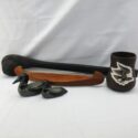 ![]() | (LOT: L233) - Native mix, black war club 23” long, 2 Boma loons 5” & 4” long, incense burner wood canoe 14” long, brown pottery vase with eagle picture 4 ½” tall | ||