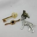 ![]() | (LOT: L253) - A collection of brooches and pins, including two gold toned ones with rhinestones or crystals, a horse pin with sparkly stones in the mane and tail, and a Dalmatian brooch made of what looks to be pewter. | ||