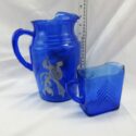![]() | (LOT: L277) - vintage blue glass water/ juice pitcher, 9” tall with Mexican scene, MCM, blue glass cream pitcher | ||