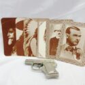 ![]() | (LOT: L286) - six “ cowboy “ cabinet post-cards, 6.5”x4.5”, “ Detective” toy cap gun, silver metal, 5” length | ||