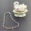 ![]() | (LOT: Q211) - Sterling silver champagne toast pendnat on chain, purple fluorite earrings and a Amethyst ring that is adjustable | ||