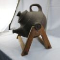 ![]() | (LOT: S188) - Unique vintage heavy piece of thick earthen ware huge pot 5 litre pôt with lid on wood triangle stand. Side knobs hang on wooden base and swing solid handle at back to control pour. Raw earthy textures, organic sh... | ||