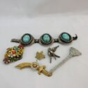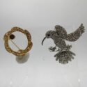 ![]() (LOT: K398) | ![]() A lovely silver tone hummingbird rhinestone roach. Lots of nice sparkle to this. Brand new! Also a vintage Christmas wreath style brooch, gold colouref with a garnet Centerstone. It is possible that this is gold plated, but there are no markings. (Click Here to see full auction listing) Bidding opens on December 01, 2025 12:00:00 AM | |