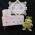 ![]() (LOT: G57) | ![]() a collection of decorative and storage items, including: A small, pink chest of drawers on gold-colored legs. A decorative sign that says "FRIENDS WELCOME FAMILY". A figurine of a frog holding a sign that says "SHHH Sleeping Weeds." and a extra drawer for the small pink chest too (Click Here to see full auction listing) Bidding opens on November 10, 2025 12:00:00 AM | |